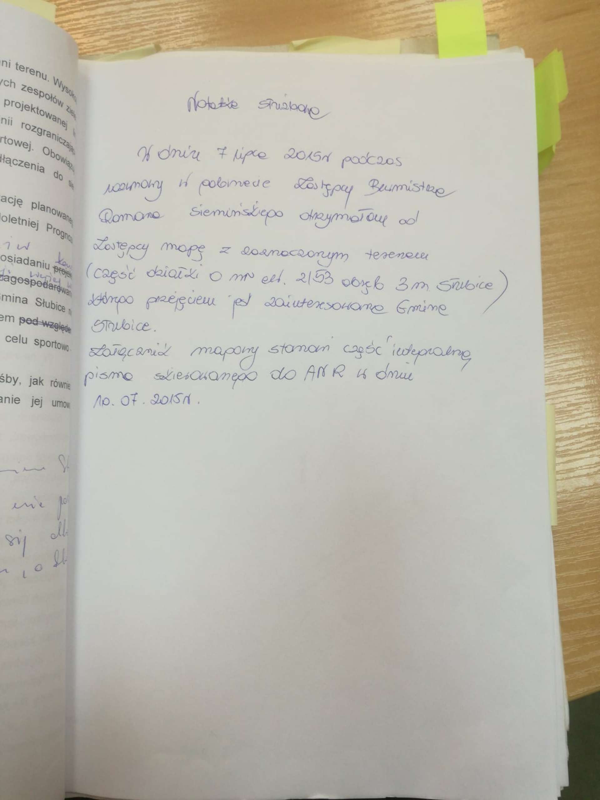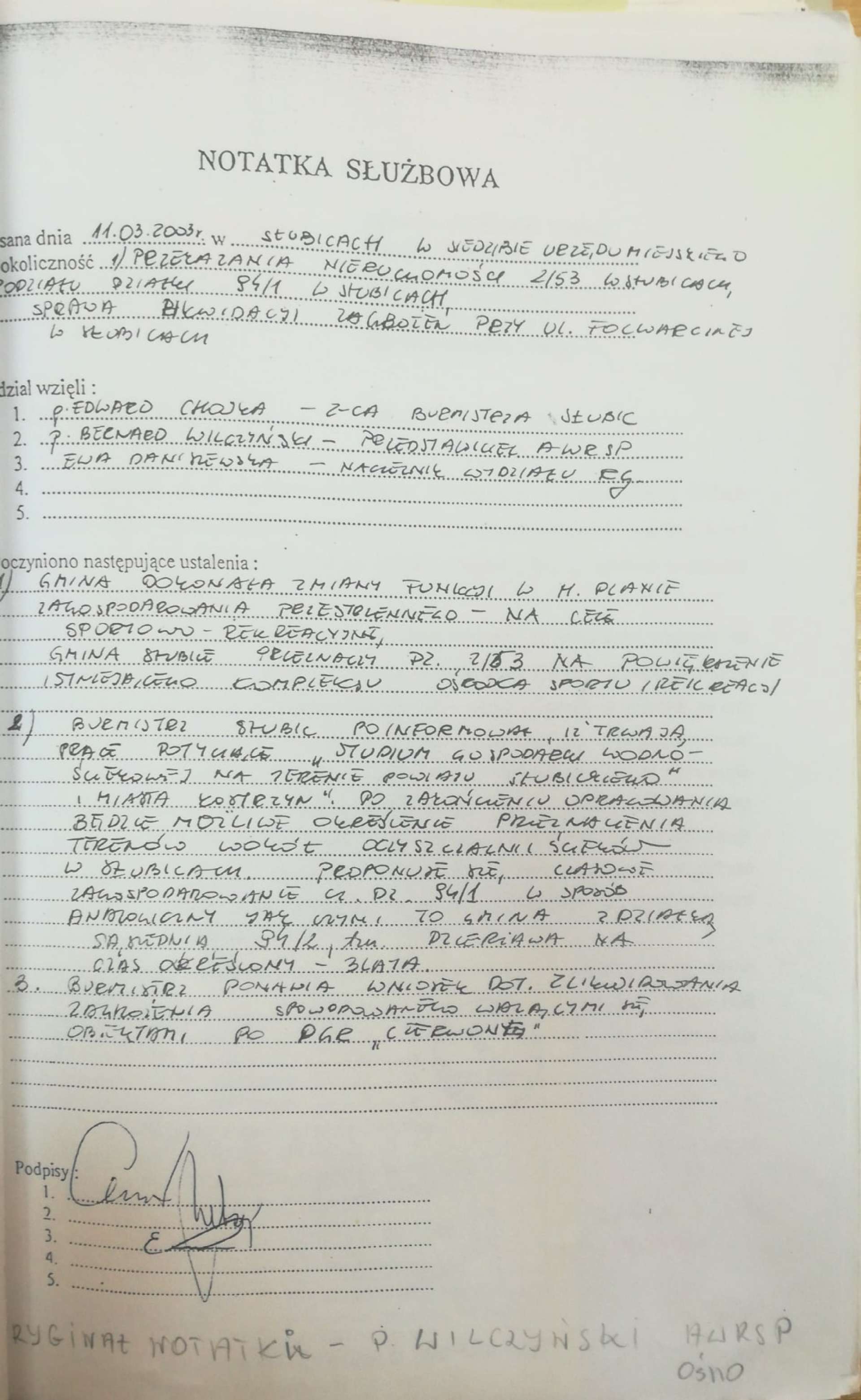 Kroki w tym kierunku początkowo podejmowane były także w 2015 roku za kadencji T. Ciszewicza. Jednak ostatecznie nakazano pracownikom gminy ich zaprzestania (pismo z dn. 6.08.2015 r.). Późniejsze odpowiedzi na nasze wnioski i pisma świadczą o wyraźnej niechęci władz wobec tych postulatów. Burmistrz odrzucał wówczas podjęcie takiego działania, mimo nałożonego na niego przez uchwałę intencyjną Rady Miejskiej z 1998 roku zobowiązania do przejęcia tego terenu (!). Konsekwencją tego było wystawienie działki na sprzedaż przez Agencję Nieruchomości Rolnych i jej zakup (dopiero!) na 6. przetargu przez prywatnego przedsiębiorcę w 2018 roku. Warto podkreślić, że wbrew początkowym oporom ze strony Skarbu Państwa z lat 90. i wczesnych 2000., dokumenty z lat 2015-2017 odczytać można jako świadczące raczej o otwartości na przekazanie gminie tego gruntu. Była to możliwość, którą ówczesne władze zaprzepaściły (patrz - pismo z dn. 17.02.2017 r.).
