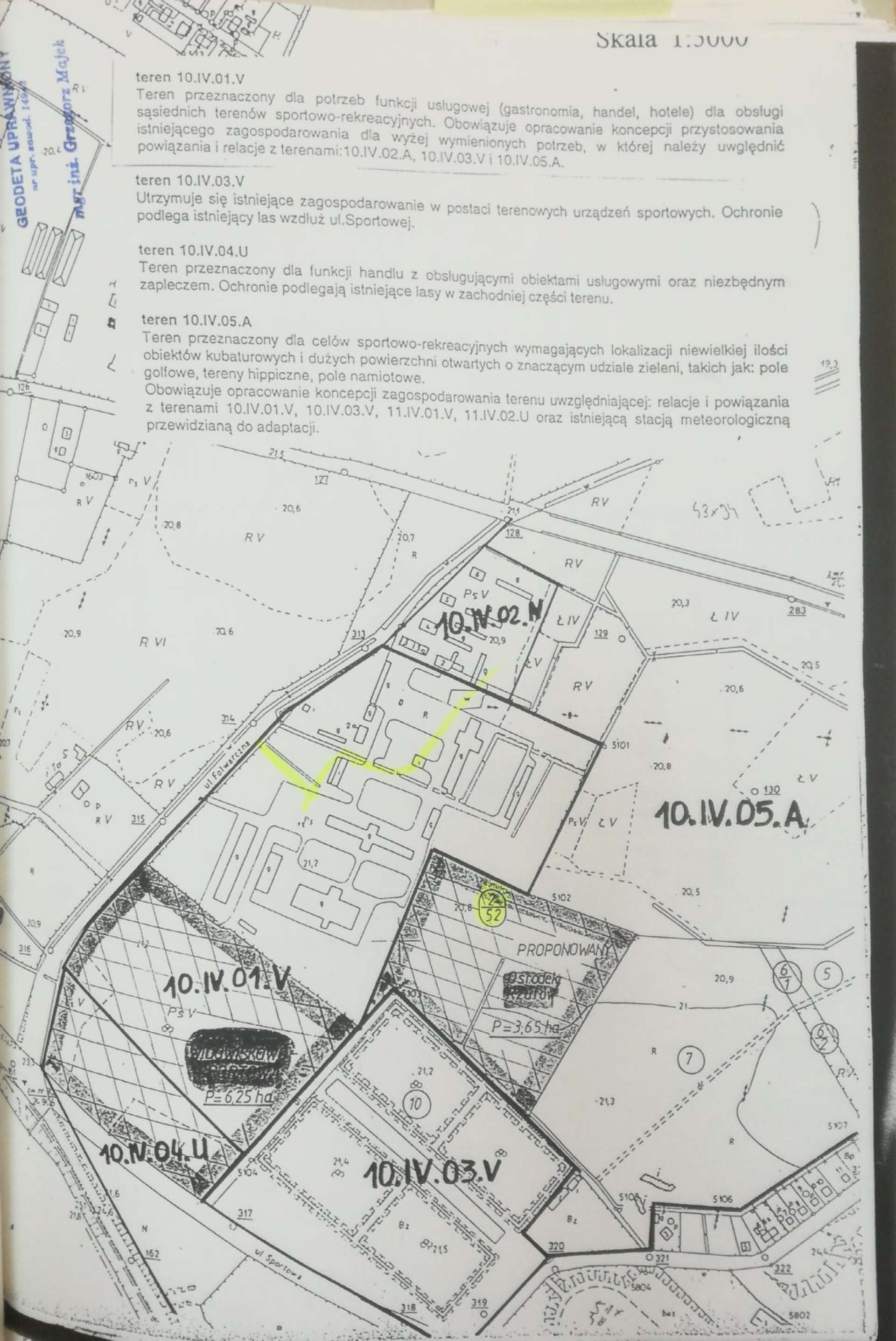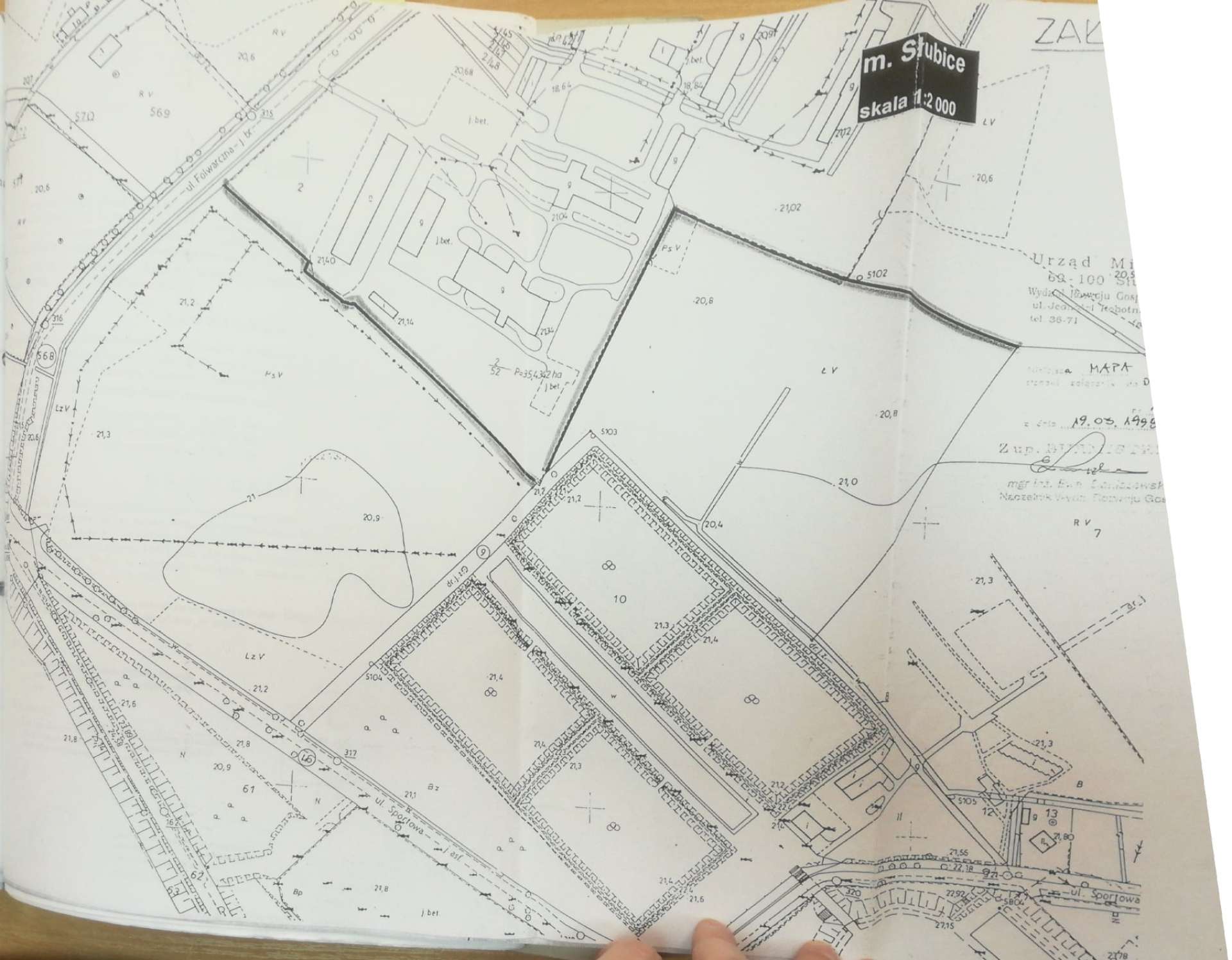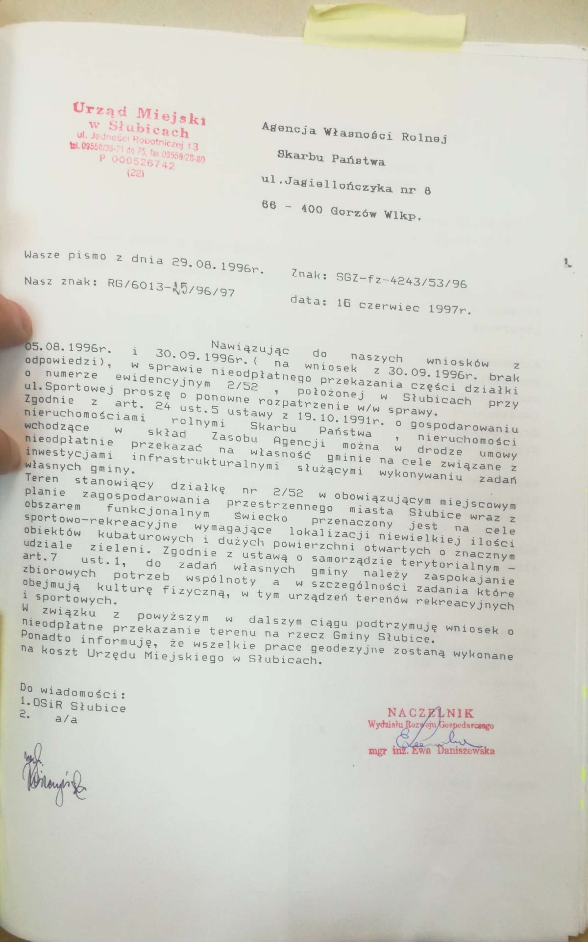 Wśród dokumentów znajdują się pierwsze, podpisane przez R. Chusteckiego i M. Jabłońskiego wnioski z roku 1996, dotyczące terenu ówczesnej działki nr 2/52, a stanowiące zaczątek późniejszych prób przejęcia działki nr 2/53, która została z niej wyodrębniona. Istotnymi datami są także 2.04.1998 r. kiedy to Rada Miejska przyjęła uchwałę intencyjną w sprawie woli nabycia tej nieruchomości i 27.01.2000 r. gdy uchwaliła dla niej plan miejscowy, zabezpieczający ten obszar na cele sportu i rekreacji z możliwością zabudowy do 20% terenu. Do tematu wracano głównie za kadencji S. Ciecierskiego i R. Bodziackiego.