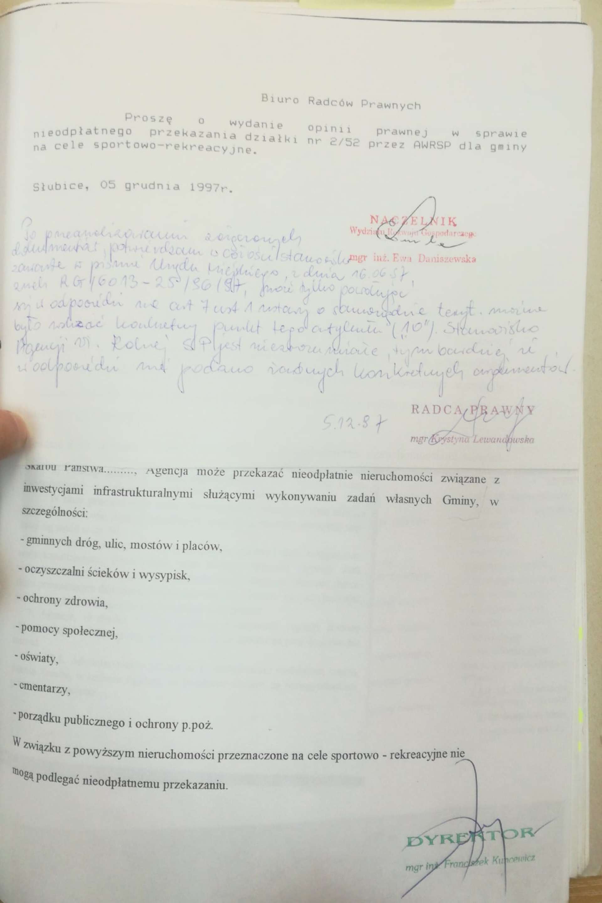 W naszym odczuciu, przedstawione dokumenty jednoznacznie przemawiają za podjęciem wszelkich możliwych kroków ze strony obecnych władz miejskich w celu nabycia tego terenu. Uzasadnia to jego strategiczne znaczenie dla miasta, związane bezpośrednio z możliwością rozwoju kompleksu stadionu w Słubicach, a także udokumentowana, historyczna ciągłość dążeń poprzedników i podejmowanych przez nich licznych starań w tym kierunku. Ówcześni reprezentanci wyrażali w ten sposób bowiem wolę mieszkańców całej gminy wobec tego terenu. Uważamy, że także obecne władze nie powinny odbiegać od realizacji idei przyłączenia przedmiotowego obszaru do stadionu, tylko w ramach dostępnych dla siebie szerokich możliwości, wykorzystać każdą nadarzającą się i korzystną dla Gminy sposobność, by naprawić historyczny błąd popełniony w 2015 roku. Wyrażona przez obecnego właściciela działki wola zamiany tego terenu, może rokować ostrożne nadzieje na zakończenie obecnej kryzysowej sytuacji związanej z toczącą się na niej zmianą dokumentów planistycznych. Liczymy, iż temat znajdzie godny finał, który mógłby stanowić pomyślne zakończenie ponad 20 letnich starań, zmierzających do urzeczywistnienia aspiracji mieszkańców gminy w zakresie rekreacyjnego rozwoju naszego miasta na tym terenie.