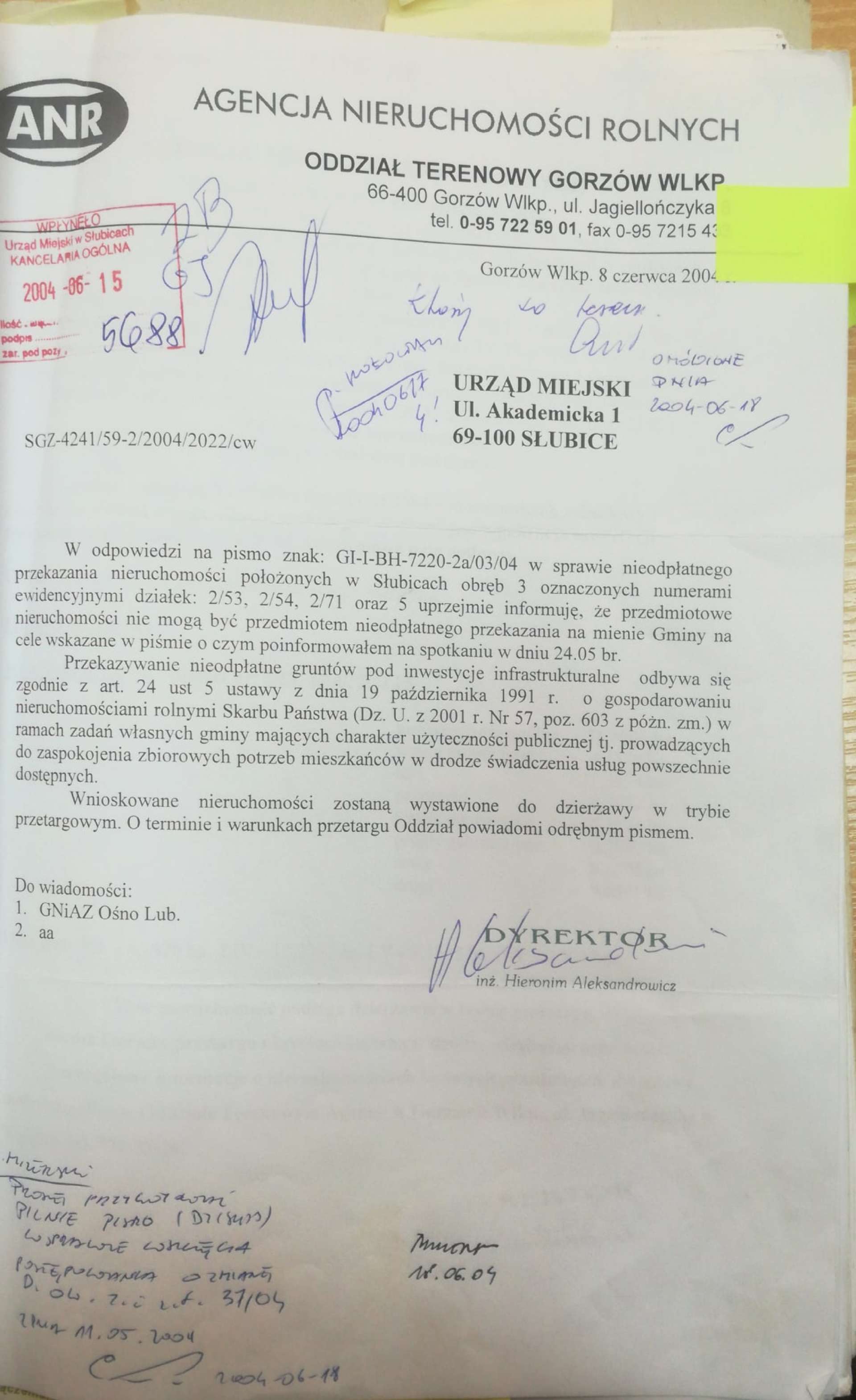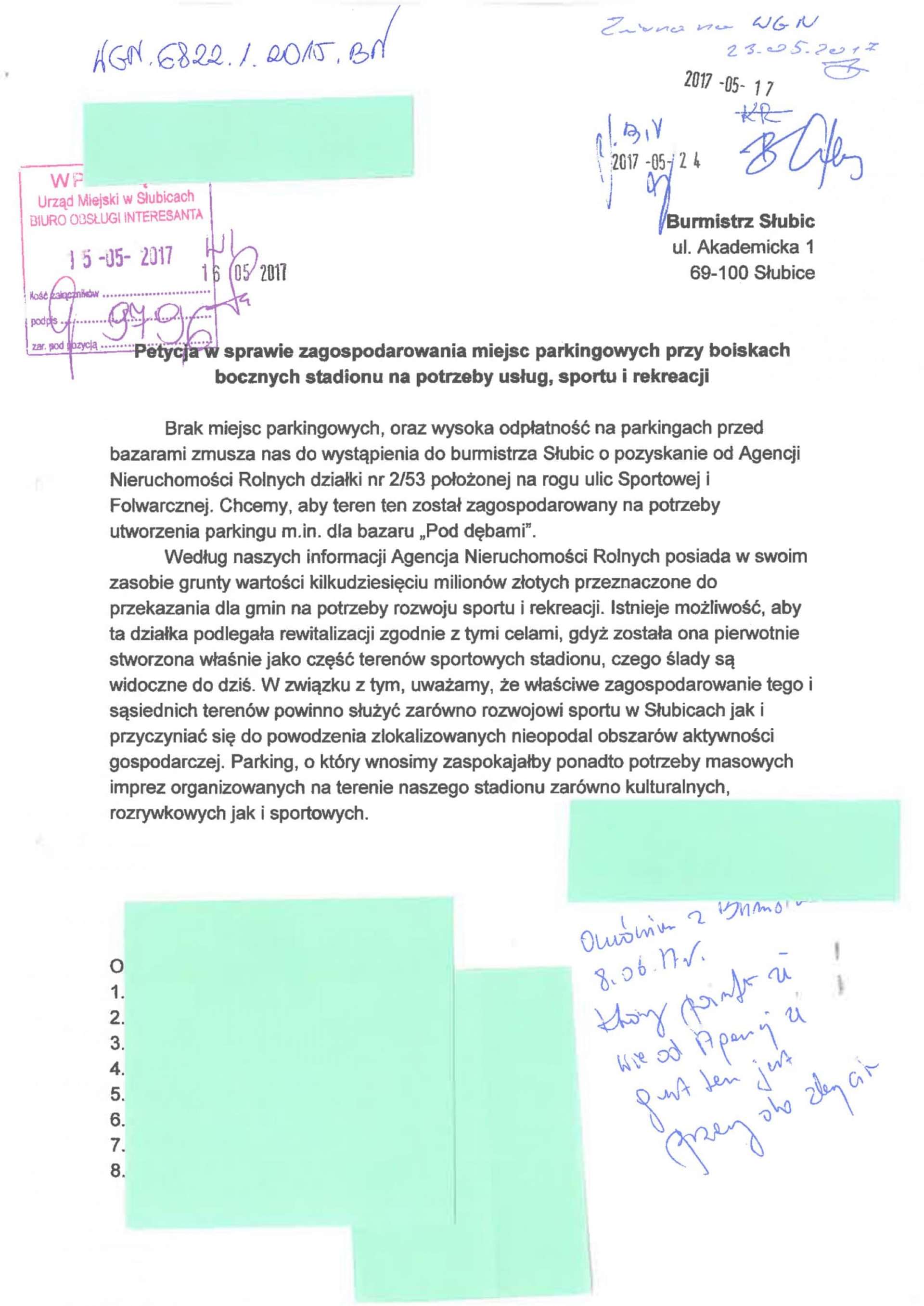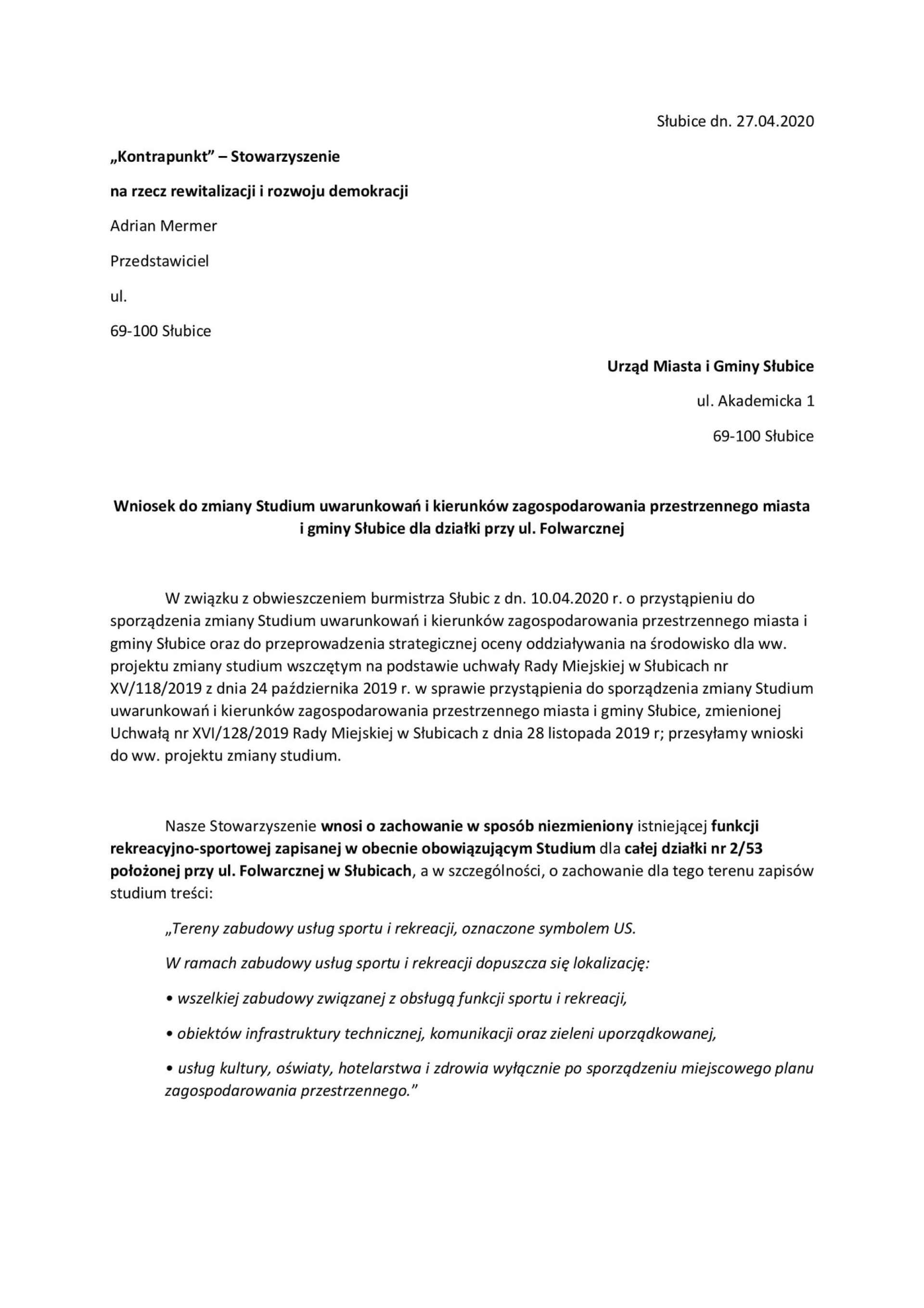 W związku z pojawiającymi się informacjami o możliwości przejęcia przez Gminę działki nr 2/53 położonej przy ulicy Folwarcznej od jej obecnego właściciela w drodze zamiany nieruchomości, poniżej przedstawiamy zaczerpnięte z urzędu miejskiego dokumenty dotyczące poprzednich prób nabycia tego terenu na rzecz miasta. Jest to obszar, w sprawie którego, wobec ogłoszenia planów przekształcenia go na cele handlu wielkopowierzchniowego, złożona została petycja 626 osób o zachowanie go na cele sportu i rekreacji. Ze zgromadzonych materiałów odczytać można wieloletnie starania i intensywne zaangażowanie kolejnych władz miejskich w tym kierunku. Załączamy również treść korespondencji stowarzyszenia "Kontrapunkt" z Urzędem Miejskim w Słubicach wraz z wnioskami kierowanymi przez nas w tym temacie w latach 2017-2020.