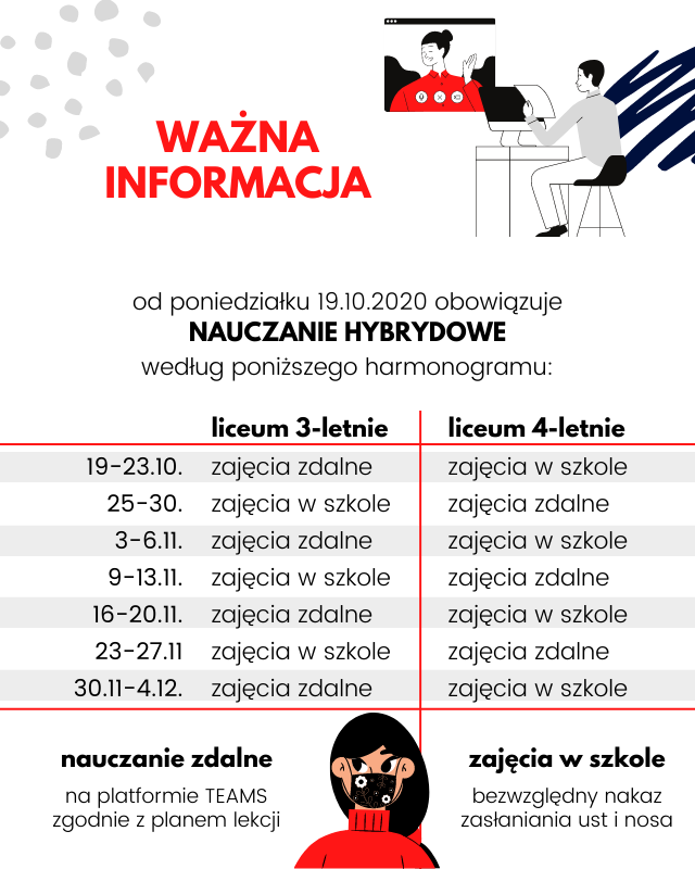 W dniach 19-23.10 klasy liceum 3-letniego mają zajęcia zdalne na TEAMS, klasy liceum 4-letniego- w szkole. W dniach 25-30.10 klasy liceum 4-letniego- zdalnie, liceum 3-letniego - w szkole. W następnych tygodniach - naprzemiennie.